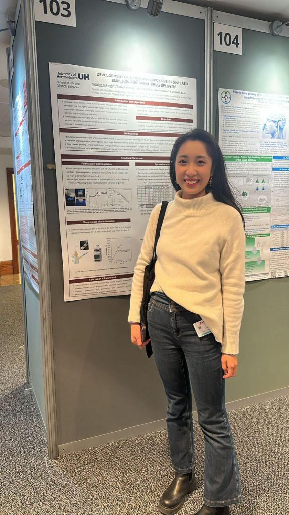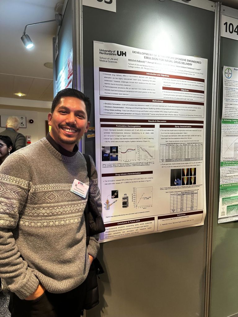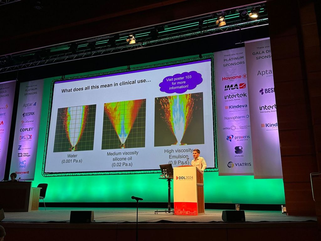 Hessam gave his first major oral presentation on trying to spray viscous materials up the nose to form retentive medicines. He was terrified but did a sterling job regardless. Here he is looking like he’s just set off some fireworks, but are actually spray plumes from increasingly viscous vehicles.